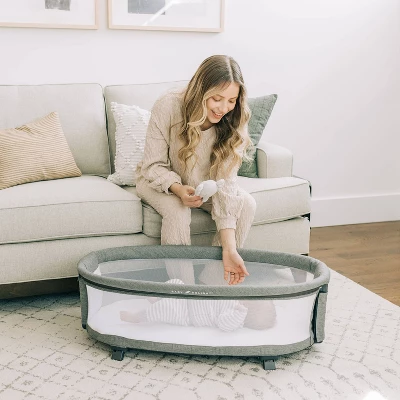 - Bassinet can be used in the sturdy base or removed for portability in any room in the home