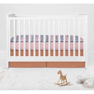 - This Bacati 10-piece Crib Set Includes Reversible 4 layered muslin lux blanket/Playmat (33 x 43 inches), Muslin Crib fitted sheet (52 x 28 x 6 inches), Cotton Percale Crib Skirt/Dust ruffle (13 inch drop), 3 pc Wall Hangings Set, Musical Mobile and Four Muslin Swaddling Blankets in fun, colorful and signature prints in super soft breathable 100 percent cotton muslin fabrics. Designed in United States by Experienced Designers. Many coordinating items available to purchase separately in this Bacati Girls Triangles Mint Navy Bedding Collection.