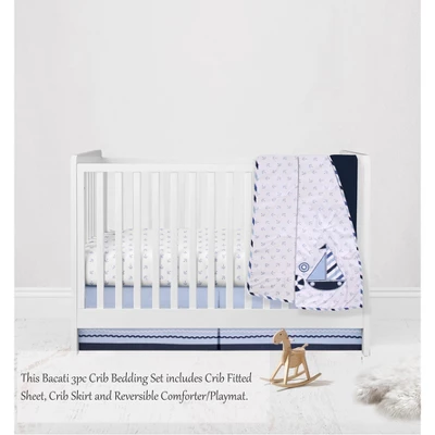 - This Bacati 3-piece Crib Set Includes Reversible Comforter/Playmat (33 x 43 inches), Crib fitted sheet (52 x 28 x 6 inches) and Crib Skirt/Dust ruffle (13 inch drop) in fun, colorful and signature prints in 100 percent cotton 200 Thread Count percale fabrics. Designed in United States by Experienced Designers. Many coordinating items available to purchase separately in this Bacati Little Sailor Anchor Boat Blue Navy Bedding Collection.