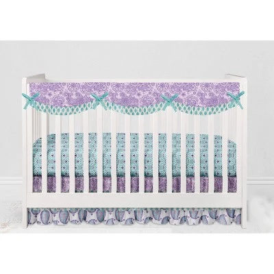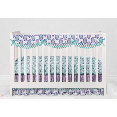 - This Bacati 10-piece Crib Set Includes Reversible Comforter/Playmat (33 x 43 inches), Crib fitted sheet (52 x 28 x 6 inches), Crib Skirt/Dust ruffle (13 inch drop) Diaper Stacker (holds more than 30 newborn diapers), Reversible Long Crib Rail Guard Cover (52 x 12 inches), Window Valance (15 h x 56 w inches with 1.75 inch Rod Pocket), 3 pc Wall Hangings Set and Musical Mobile in fun, colorful and signature prints in 100 percent cotton 200 Thread Count percale fabrics. Designed in United States by Experienced Designers. Many coordinating items available to purchase separately in this Bacati Paisley Isabella Purple Lilac Aqua Bedding Collection.