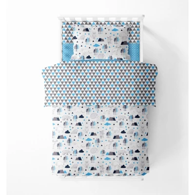 - This Bacati 4-piece Toddler Bedding Set Set Includes Reversible Oversize Comforter (42 x 55 inches), Toddler Bed Fitted Sheet(52 x 28 x 6 inches), Toddler Bed Flat Sheet(52 x 42 inches) which is fitted at the bottom to make the bed easily and Standard Pillow Case (20 x 25 inches) with french ties on the back in fun, colorful and signature prints in 100 percent cotton 200 Thread Count percale fabrics. Designed in United States by Experienced Designers. Many coordinating items available to purchase separately in this Bacati Woodlands Aqua Navy Gray Bedding Collection.