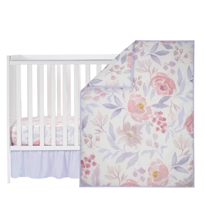 Dress your babyโs crib with this stunning watercolor floral three-piece infant nursery crib bedding set. Included is one quilt/comforter, one floral fitted crib sheet and one crib skirt made in a soft microfiber material. This lovely floral design has pretty shades of pinks and lavenders with a touch of sunshine yellow. Our favorite roses and peonies flowers decorate the quilt along with graceful flowy leaves. The fitted crib sheet has elastic all the way around ensuring a safe and secure fit on a standard-size crib mattress measuring 28โ X 52โ. The crib skirt adds the finishing touch and is a beautiful shade of lavender purple. It is shirred for a more luxurious look and has a 10โ drop.