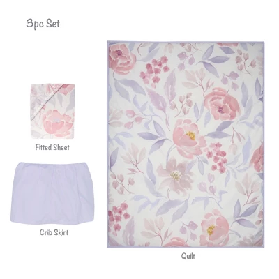 - Beautiful floral 3-piece crib bedding set includes one quilt, one crib skirt and one fitted crib sheet