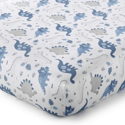 - ADORABLE DINOSAURS THEME: You will think you are a dinosaur adventure with our adorable prehistoric look. The fitted sheet is toss of cute dinosaurs, or switch it out with the one featuring . The quilt features appliqued, embroidered dinosaurs and leaves. The bedskirt has pieced blue with grey check, while the large nursery wall decal depicts a variety ofdinosaurs and plant leaves, completing your prehistoric nursery look.