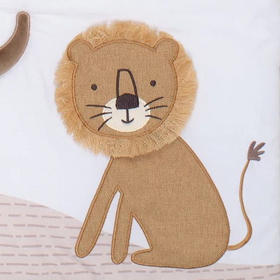 All afloat on Noahโs boat. This three-piece nursery crib bedding set includes one quilt, one breathable 100% cotton fitted crib sheet, and one crib skirt (dust ruffle). Upscale fabrications of minky, boucle, fleece, velour, woven fabrics and knits were used to create this amazing baby bedding set. Eddie the elephant is appliqued in taupe velour and has a cute furry textured fleece sheep standing on his back. Leonardo, the lion, is appliqued in a textured woven fabric and has a 3-dimensional fringe mane. There are stacked animals on the left side of the quilt that include a tall giraffe made of curly boucle, a friendly bear, and a silly alligator standing with one foot on top of the bearโs head. A white velour dove and a white fleece sheep add to the fun. In the distance is Noahโs Ark made in a thermal knit along with majestic mountains. The breathable 100% cotton fitted crib sheet features giraffes, bears, rhinos, lions, elephants, sheep, alligators, whales , rabbits, and doves. There is elastic all the way around ensuring a safe and secure fit on a standard sized mattress measuring 52โ X 28โ. The crib skirt adds the finishing touch to your childโs crib. The upper panel features a horizontal taupe dash print on a creamy ground. The lower panel is a coordinating solid taupe with white tassel trim and has a 14 ยฝโ drop.