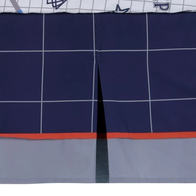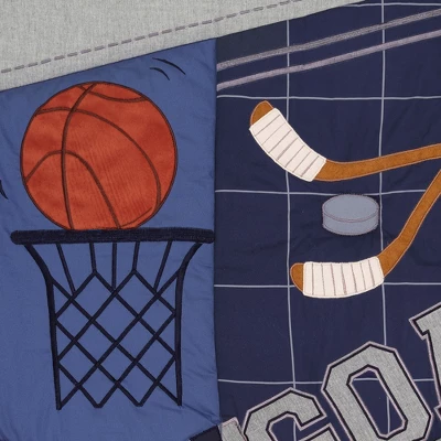 Your little one will sleep like an all-star with this custom designed sports theme crib bedding set. The three-piece set includes one quilt, one breathable 100% cotton fitted crib sheet, and one crib skirt. The patchwork style quilt, which is completely appliqued and embroidered, includes textured fabrications of heather gray chambray, velour, and faux suede. Featured sports include basketball, football, baseball, hockey, and soccer. The back of the quilt is a navy and gray windowpane pattern. The breathable 100% cotton fitted crib sheet includes all sports along with colorful stars. It has elastic all the way around ensuring a safe and secure fit on a standard-sized crib mattress measuring 28โ X 52.โ The crib skirt adds the finishing touch to your childโs crib. It is a cotton poly blend and has two front pleats. The upper panel is a navy and gray windowpane, and the lower panel is solid gray with a rust color trim in between. The four-sided crib skirt has a 14 ยฝโ drop.