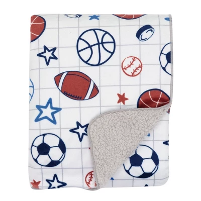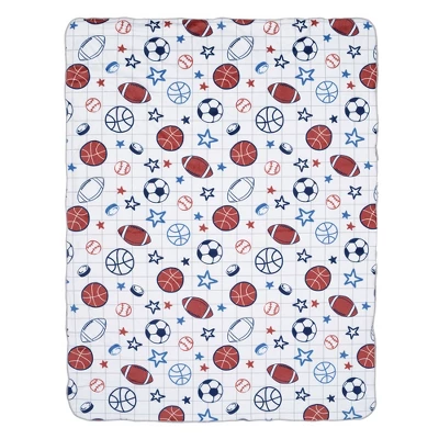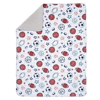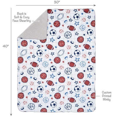 Your little sports fan will be warm and cozy with this fleece minky front and faux shearling back blanket. The front is filled with baseballs, basketballs, soccer balls, footballs, hockey pucks, and multiple sized stars on a white background with a gray crisscross pattern. Perfectly sized stroller blanket for babies on the go at 30โ X 40โ. This blanket is a top baby registry item and makes a great baby shower gift or welcome home baby gift.