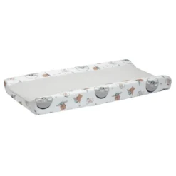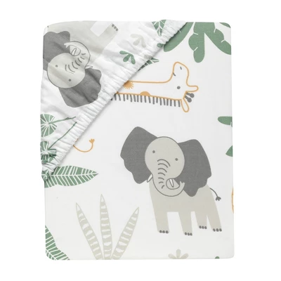 This breathable 100% cotton fitted crib sheet is an adorable print that includes all of our friendly jungle animals along with trees, leaves, and birds. This baby crib sheet has a white ground with shades of gray, green, and tan. It has elastic all the way around ensuring a safe and secure fit on a standard size crib mattress measuring 28” X 52”. It coordinates with many different jungle sets and was specifically designed for the Jungle Friends nursery collection by Lambs & Ivy.