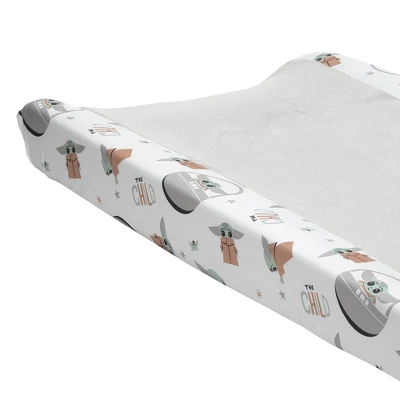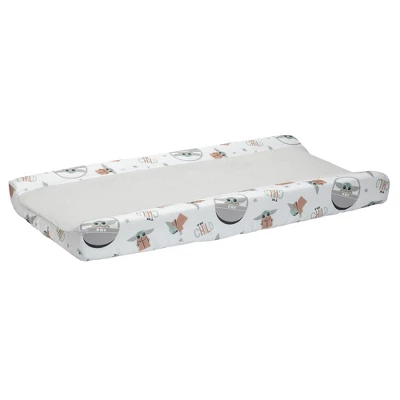 A trendy gray soft luxurious coral fleece center is perfect for changing your little one. The side panels are a soft microfiber featuring Baby Yoda in different poses along with the words “The Child”. There are buttonholes for the changing pad straps so your little one is safe and secure while getting their diaper changed. It is machine washable for easy care. Fits most standard size changing pads.