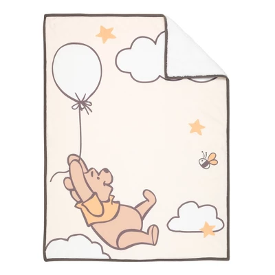 Everyone’s favorite Disney bear, Winnie the Pooh is prominently featured on this photo opportunity blanket. Pooh is wearing his favorite shirt and is drifting up in the clouds with a large white balloon. The front of the blanket is a creamy minky and the back is a cozy white faux shearling. There is an open space on the blanket for you to take a keepsake photo of your little one, perfect for sharing with family and on social media. It’s a great way to capture a special moment.