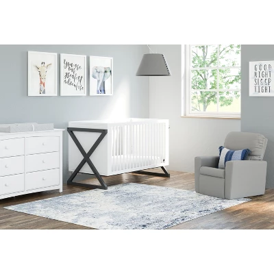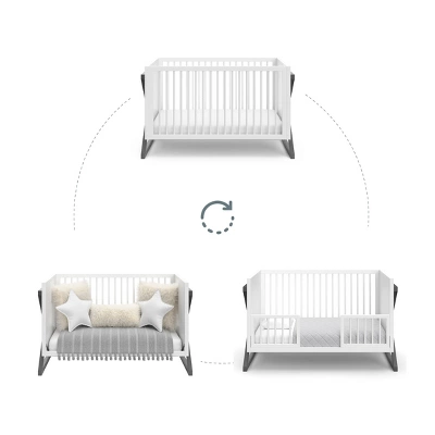 The Storkcraft Equinox 3-in-1 Convertible Crib is a stunning addition to the modern nursery. With its clean lines, two-tone finish, and signature “X” design, the Equinox is an eye-catching baby crib that add a designer look to any nursery. Designed to adapt to your growing baby, the Storkcraft Equinox Convertible Crib is equipped with a 3-position adjustable mattress support base, and can convert from a crib into a daybed and toddler bed (compatible Graco Universal Toddler Safety Guardrail (Dowels) sold separately).